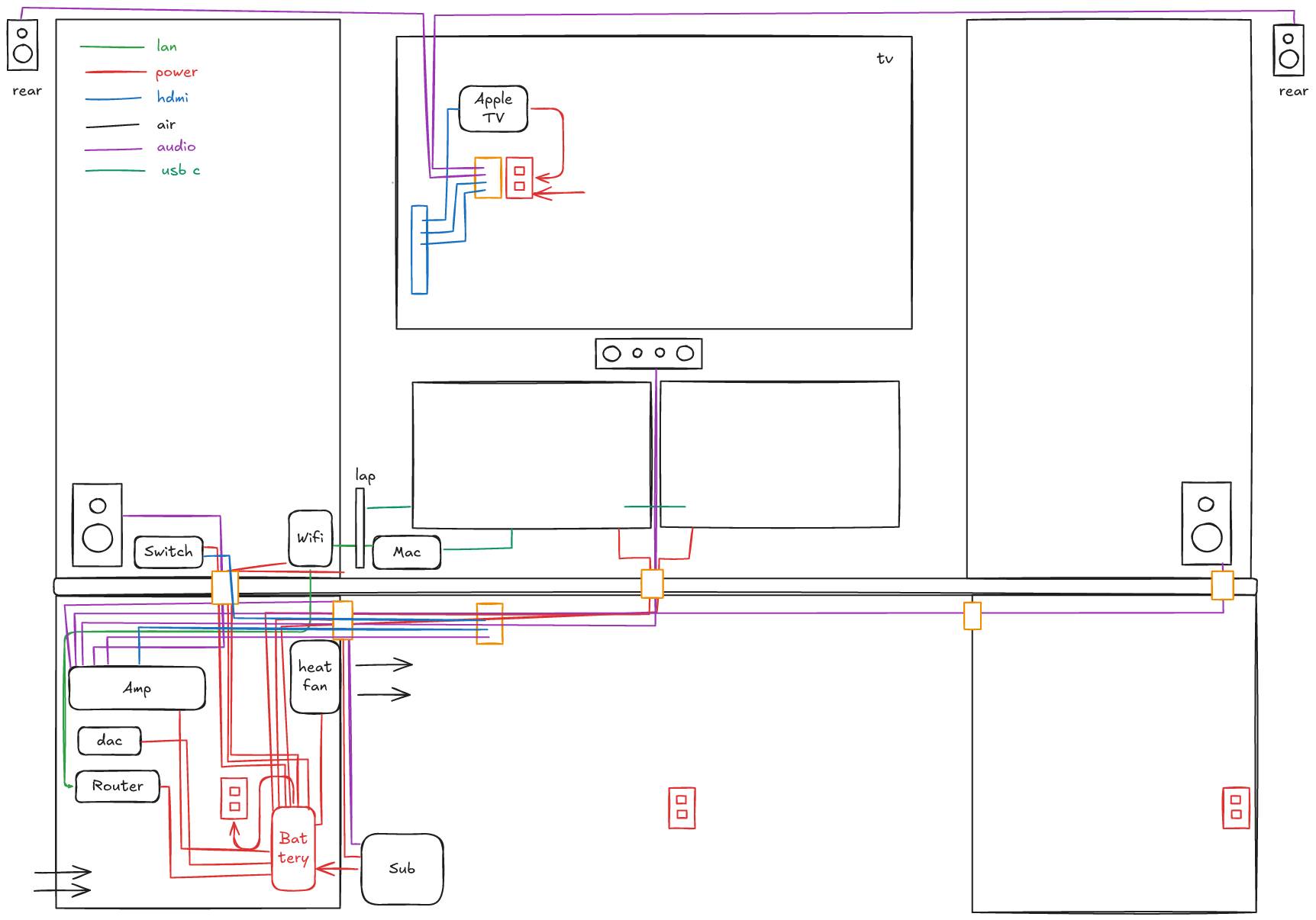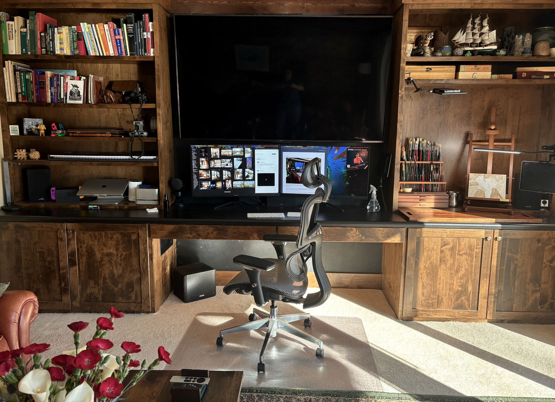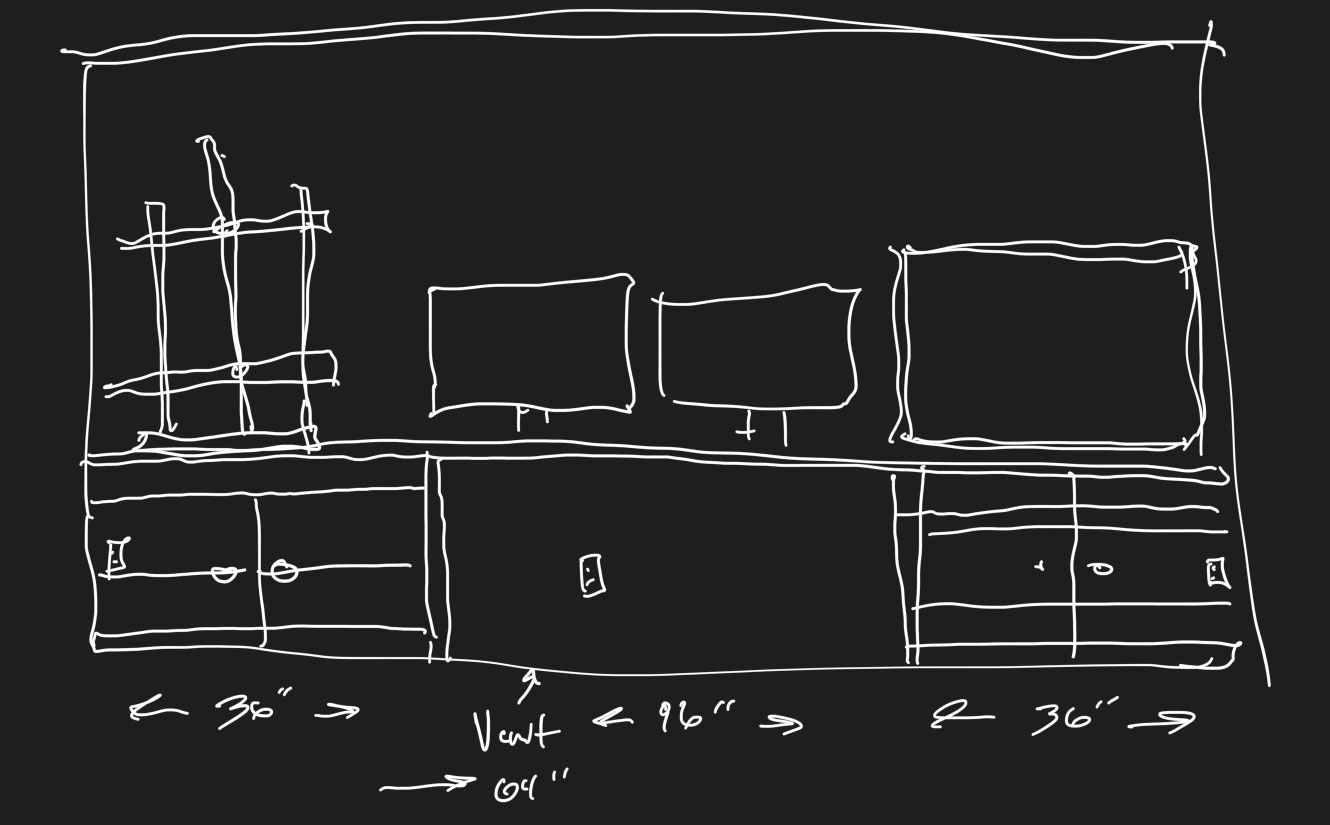 Our house has a living room and a den. We rarely used the den and it originally had a pool table in it which we donated to a local church. At one point I had an easel and art supplies on top of the pool table, but I rarely used them either. If you look at my notes1 on it, you can see the original sketches for the setup, cabinetry, and wiring. There isn’t a single wire showing anywhere. I enjoy the planning as much as anything and I had also originally considered building the cabinetry myself.