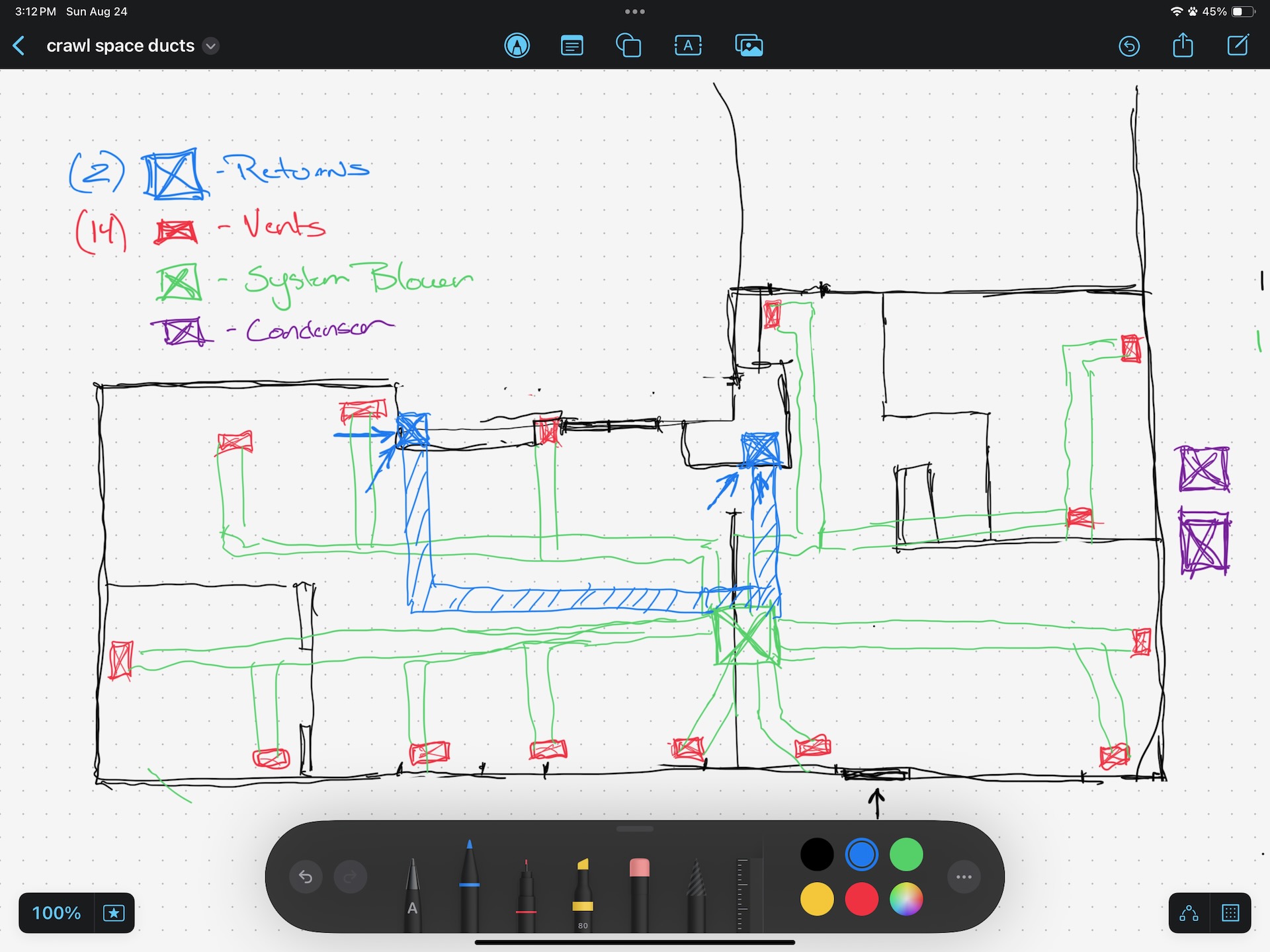 We recently added a gas tankless water heater in the crawlspace and I also needed to familiarize myself with the operation for maintenance. For my own reference, it's a Navien NPE-210A6 and requires a yearly flush. I mapped out the duct work in the crawlspace in the process.